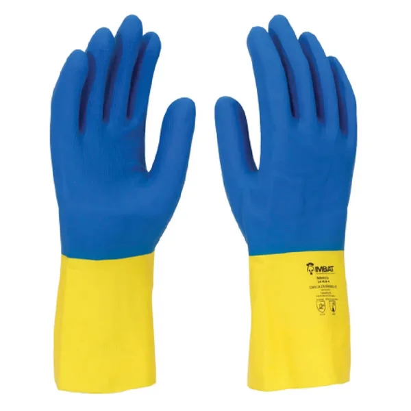 Luva de segurança confeccionada em látex e neoprene de cor azul na palma e no dorso, com punho amarelo em látex, internamente flocada, acabamento antiderrapante na palma, face palmar dos dedos e pontas dos dedos.